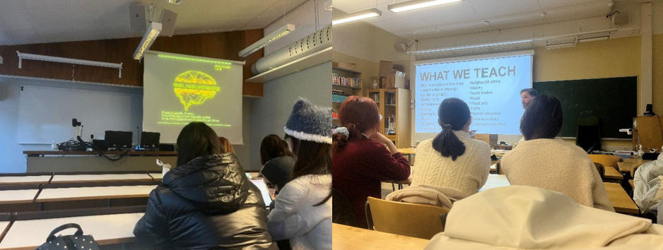 另外一个令我印象深刻的课程是1.30日上午Tervaniemi老师介绍有关音乐学习促进大脑发展的相关研究,让我认识到音乐学习过程中大脑各个脑区的协调工作,以及音乐学习对于儿童语言能力、认知能力和社会技能的助推作用。之后,老师还介绍了在芬兰的学前教育中如何有效地利用音乐教育来促进孩子们的积极发展。在这一天下午,在赫尔辛基大学工作的牛老师为我们讲了她的研究方向“21世纪必须技能”,老师通过自身的学术经历和她女儿在芬兰中学学习的经历来展开讲解,并让我们小组讨论去发掘自身独特的优点。其中我感触最深的是老师说21世纪很重要的一个能力是“学会学习的能力”,而不只是看一个人学过多么多的知识。课后,我们真正来到了赫尔辛基当地的一所培养教师的中小学,这里的老师给我们介绍了本校的一些培养制度和学生们的学习生活,并且我们又亲自听了芬兰初中生的一节英语课,这是一次很难得的跨文化教育的体验机会。
