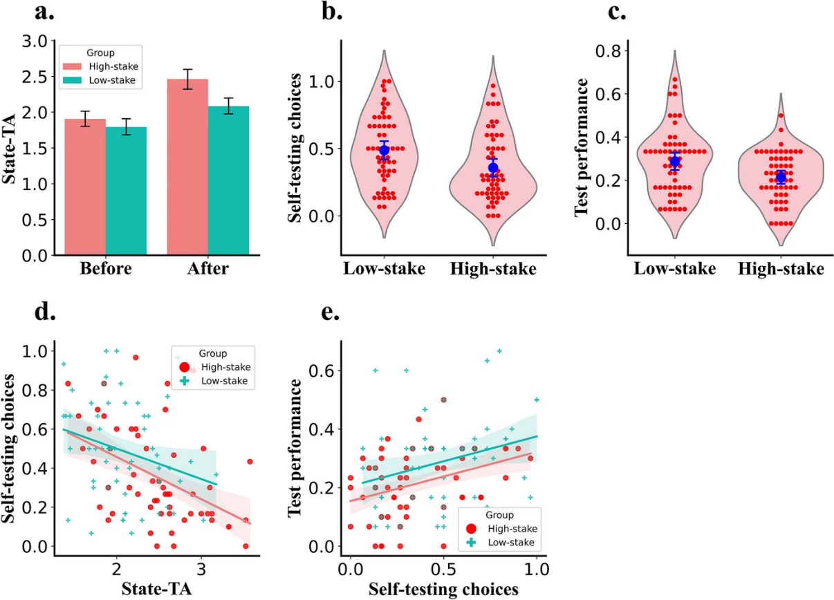 2024年6月6日,博彩网站-体育博彩网站 励耘博士后刘绍航博士(第一作者)和杨春亮副教授(通讯作者)在教育心理学国际知名期刊Educational Psychology Review上发表了题为“Effects of Test Anxiety on Self-testing and Learning Performance”的论文,揭示了考试焦虑对自我测试策略使用的消极作用,以及这种作用如何消极影响学业成绩。 大量研究表明,测试(testing)是一种高效的学习策略。相比于重复学习(restudy)和概念图(concept mapping)等方法,测试往往可以产生更好的记忆效果。不仅如此,测试还可以促进学生对于已学习知识的迁移,并提升未来学习活动的成绩。因此,学生应当在日常学习活动中高效使用自我测试策略来提升其学习效率。然而,大量研究表明,学生在学习过程中,往往会回避使用自我测试策略进行学习。对于这一现象,前人的解释是学生只将测试视作对知识掌握情况的测评工具而非学习策略,或者未能意识到测试策略对于学习与记忆的积极促进作用。然而这些理论难以解释学生自我测试规避中的个体差异,也未考虑情绪对于学生测试策略选择的影响。 本研究从考试焦虑入手,开展了5个实验,通过问卷调查、实验室实验和真实课堂实验,揭示并交叉验证了考试焦虑对测试策略使用的消极影响,以及这种消极影响对学业成绩的损害。具体而言,高特质焦虑的个体往往会规避自我测试,而自我测试的使用频率作为中介变量,又能够正向预测学生的学业成绩和任务表现,即高焦虑个体会由于不科学的学习策略选择(自我测试规避)导致学习成绩下降。除了特质焦虑所产生的影响,本研究还发现,考试的重要性或利害程度(test stake)也会影响个体在准备阶段的策略选择:考试的重要性越高,其所诱发的考试焦虑强度也越强,学习者也更愿意选择“重学”之类的低效策略,而非“测试”这一高效的学习策略。这与心理学与教育学研究结论的期待相反。