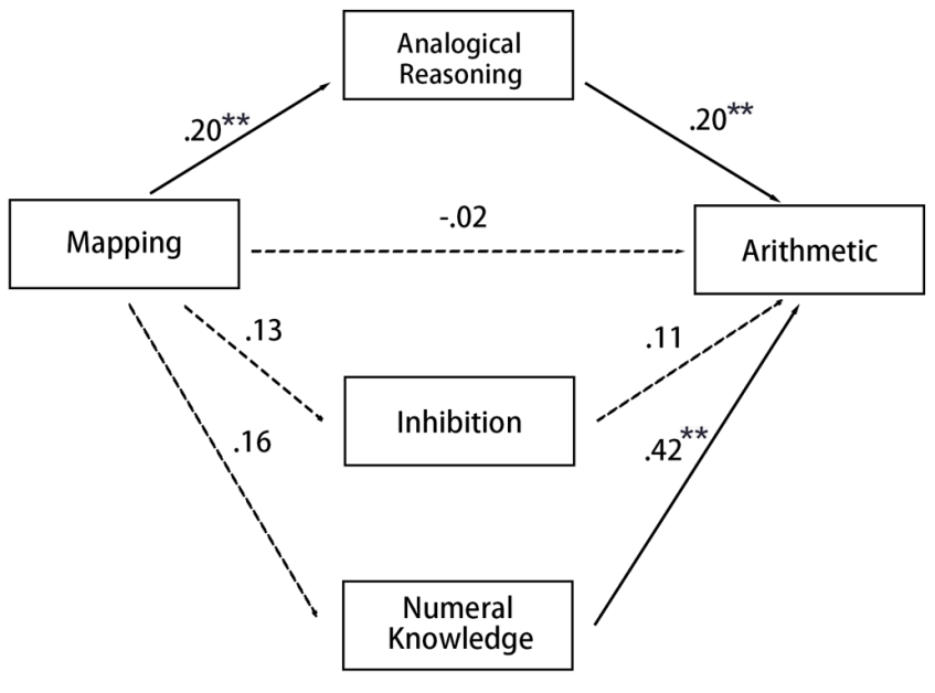 正文: 近期,博彩网站-体育博彩网站 杨秀杰副教授课题组发表了一篇题为“The longitudinal contribution of mapping to arithmetic: Do numeral knowledge, inhibition, or analogical reasoning matter?”的文章,探究了儿童早期的映射能力对于早期数学能力的可能的影响机制。该研究发表于教育心理学领域知名期刊British Journal of Educational Psychology上。 映射能力(mapping ability)是指儿童可以将数量转化为数字,并口头表达出来的能力,表明儿童能够使用数学语言表达数量概念(Mundy & Gilmore, 2009),比如,孩子最初能够从一数到十,但并不明白数字背后代表的数量概念,慢慢地孩子将数字和数量对应起来。该能力通常使用圆点数量估计任务测量(dot estimation)。近来不少研究发现儿童早期的映射能力对数学能力的发展有重要影响,但影响的机制尚不清楚。 以往研究发现儿童的执行控制能力(inhibition)、数字知识(numeral knowledge)、类比推理能力(analogical reasoning)都能够显著预测儿童早期的数学能力。同时,部分研究也发现了这三种能力和儿童映射能力的关系。比如,Purpura 等(2013) 发现数字知识显著中介非正式数学学习(例如,圆点数量估计)和正式数学能力;Gilmore 等(2013)的研究表明数量估计任务中的执行控制成分可能在数量估计能力和数学能力之间起到中介作用;而儿童在完成数量估计任务时,可能会在头脑中将眼前的数量和前一个任务中呈现的数量进行类比推理,从而估算出当下任务中的数量。因此,数字知识、执行控制能力及类比推理能力是否在儿童早期的映射能力和数学能力的关系中起到中介作用仍需要进一步研究。 我们邀请了118位幼儿园儿童(60名女孩)参与研究,每隔6个月进行一次测量,共3次。研究者第一次测量了儿童的映射能力、非言语智力,第二次测量了儿童的数字知识、执行控制能力和类比推理能力,第三次测量了儿童的数学能力。结果表明在控制了儿童的年龄、智力和性别后,儿童的映射能力仍可以显著预测儿童的数学能力。相对执行控制能力和数字知识,类比推理能力可能在映射与数学能力的关系中发挥了重要作用。
