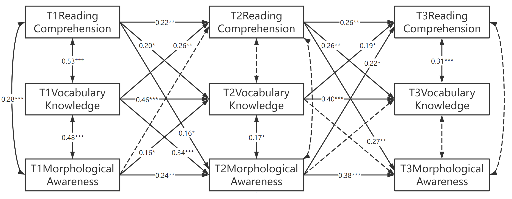 近期,博彩网站-体育博彩网站 /文理学院心理系伍新春教授课题组在国际知名的教育心理学期刊Contemporary Educational Psychology上发表了题为A golden triangle? Reciprocal effects among morphological awareness, vocabulary knowledge, and reading comprehension in Chinese children的研究论文。该研究利用伍新春教授课题组建立的小学儿童阅读能力发展数据库,追踪考察了儿童从小学三年级到六年级的语素意识、词汇知识和阅读理解的发展,并使用交叉滞后模型探讨了三者之间的交互关系。
