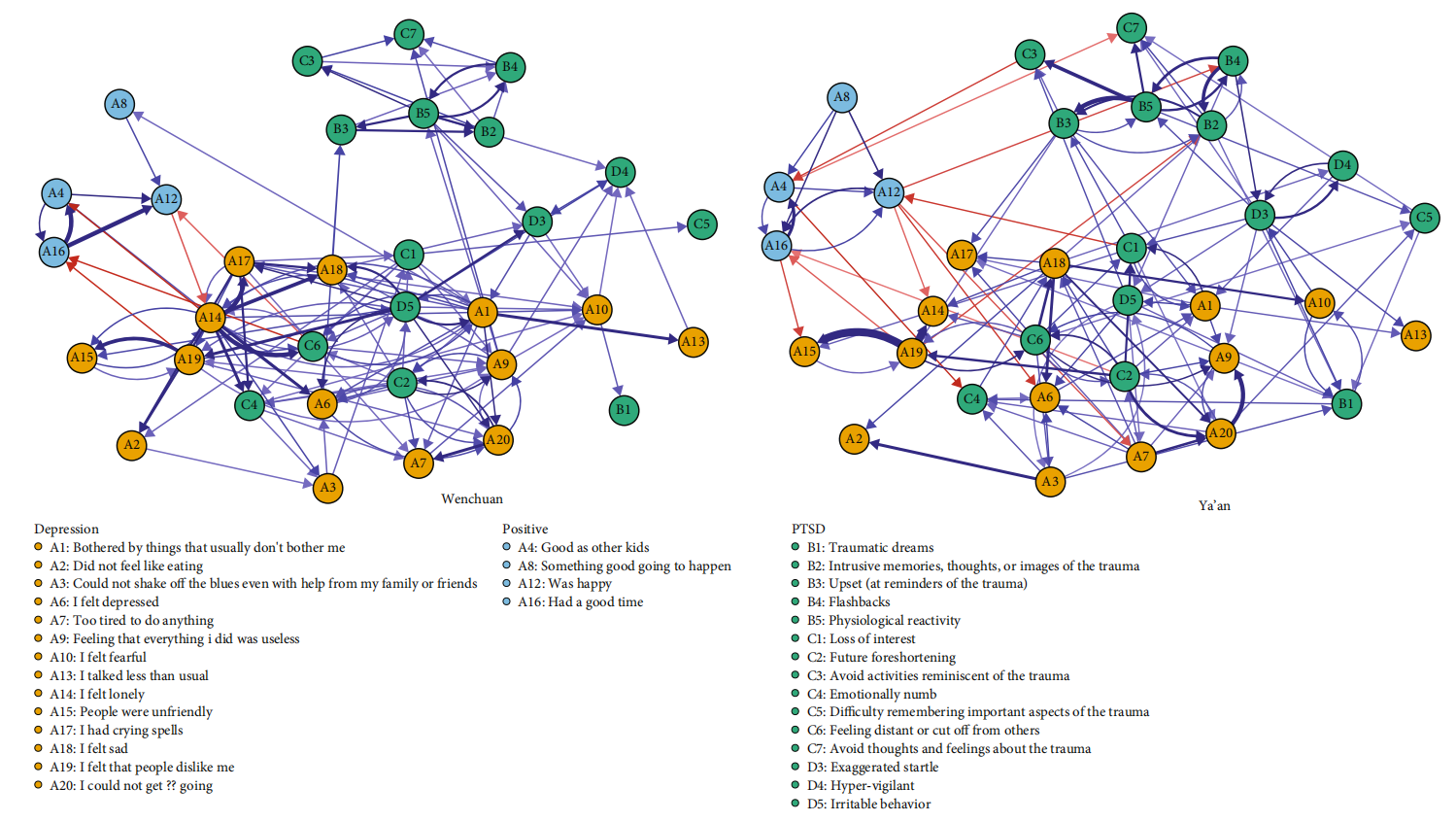 博彩网站-体育博彩网站 伍新春和王文超课题组近日在临床心理学TOP期刊Depression and Anxiety(IF = 7.4,8/131)上发文。该研究在对汶川和雅安地震后青少年两次随访调查的基础上,通过交叉对比的视角,借助交互滞后面板网络分析(cross-lagged panel network analysis,CLPN)和引导性图形分析(bootstrap exploratory graphical analysis,bootEGA)揭示了创伤后应激障碍(posttraumatic stress disorder, PTSD)和抑郁的共存模式。 研究发现,除了“难以回忆创伤的重要方面”这一症状外,其余的躁郁(dysphoria)症状均可被视为PTSD和抑郁间的桥梁症状。PTSD的闯入性和回避性症状通常会聚集在一起,而躁郁症状则倾向于同抑郁症状聚集在一起。PTSD和抑郁互为因果,而闯入性症状则是PTSD的核心症状,能激活回避性症状。汶川和雅安两个网络的全局特征类似,但局部特征存在不同。 通过建立PTSD和抑郁的共存网络,可以更好地了解二者间的关系和核心症状,有助于指导临床干预和治疗策略的制定。 论文链接://doi.org/10.1155/2023/4453663