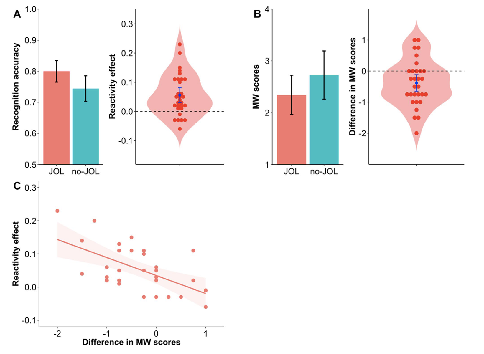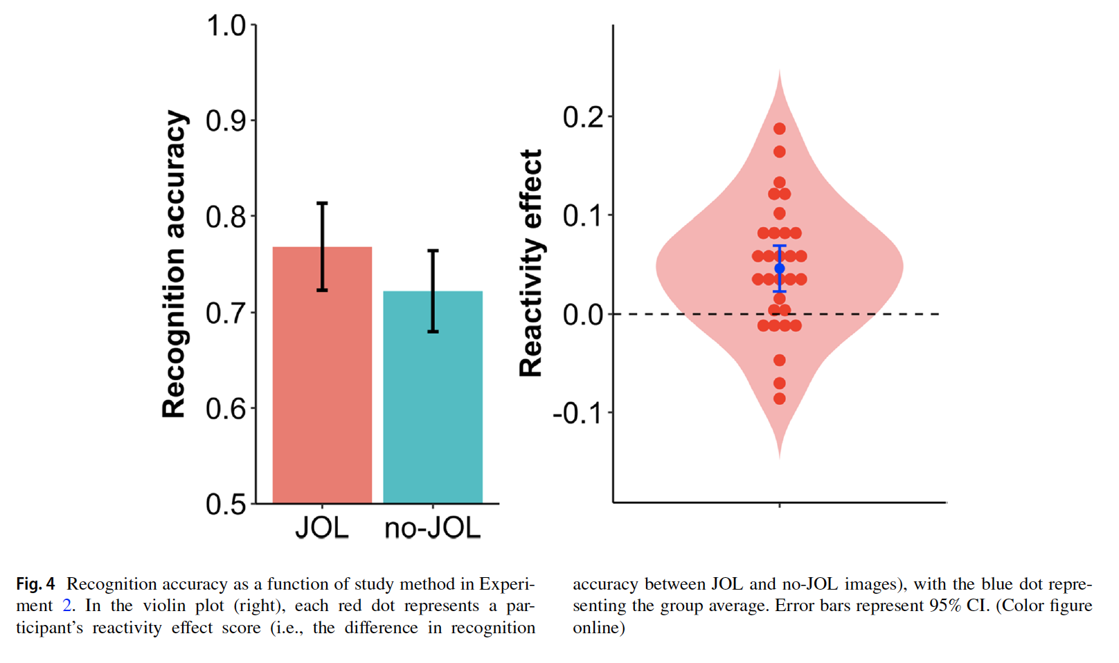 具体而言,实验1以200对各不相同的物品图片对作为材料,其中每一对物品图片均为相同物品的不同状态(例如完整的香蕉 vs 剥开的香蕉)。从每一对图片中随机选取一张组成200张的学习组,剩余与之配对的200张则作为干扰组用于后续测试。实验招募了30名被试。被试有6s的时间学习每一张图片,对于其中随机一半的图片(100张),被试还需在学习的同时进行如下的学习判断:你认为自己在后续测试中正确回忆起该张图片的概率有多大?0=完全记不住,100=完全能记住。完成学习阶段后,被试进入5分钟的计算分心任务。计算任务结束后进行测试。测试阶段中,学习过的图片会和与之配对的另一张干扰图片一左一右(随机)同时出现在频幕上,被试需要从两张图片中将此前学习过的图片识别出来。研究结果表明,被试对做过学习判断的图片识别正确率显著高于没有做过学习判断的图片,初步验证了反向效应同样适用于视觉材料的假设。