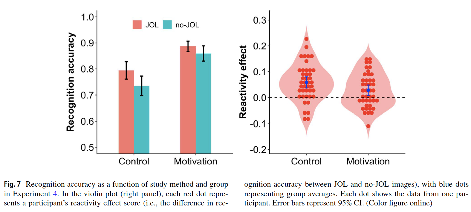 实验4在实验2的基础上加入了一个高学习动机组。具体操作为:在实验的开始阶段告知被试,其在测试阶段的最终正确率必须高于85%才能结束实验,否则需要在没有额外报酬的情况下重做整个实验,直到达到正确率标准为止(当然实际上并不需要)。低动机组则和实验2流程完全一致。按照ELE理论的预测,当学习判断带来的学习投入动机的差异被外部操纵填补,那么其带来的记忆促进效果也应当对应地下降。实验结果也的确如此。实验结果表明,动机的操纵是成功的,高动机组报告出的学习动机显著高于低动机组,即前者的学习投入更多。两因素混合方差分析的结果表明,高动机组中,做学习判断带来的测试成绩提高显著下降了。至此,实验4从另一个侧面支持了ELE理论对学习判断的反向效应机制的解释。