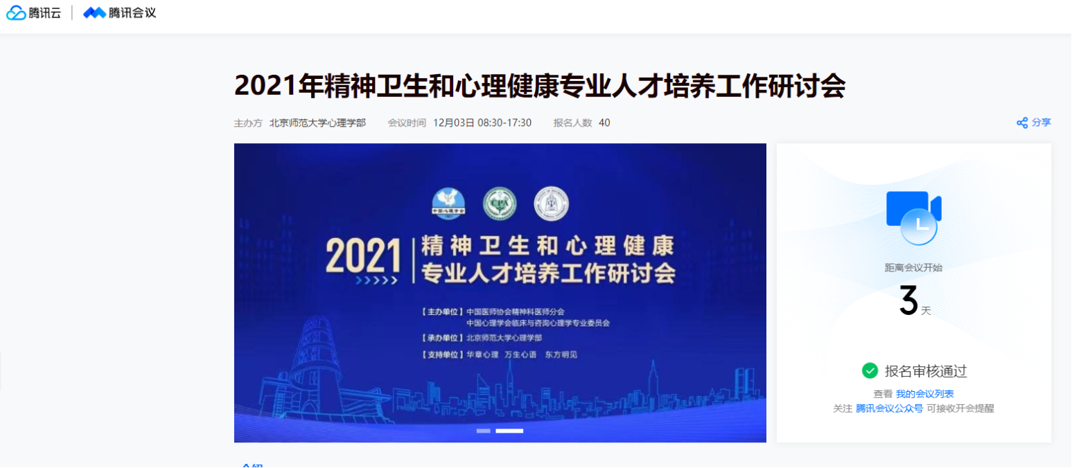 尊敬的参会代表: 您好!欢迎您参加由中国医师协会精神科医师分会、中国心理学会临床与咨询心理学专业委员会主办,博彩网站-体育博彩网站 承办的《2021年精神卫生和心理健康专业人才培养工作研讨会》,为了使您更好的参与本次会议,请知悉以下事项: 一、会议时间 2021年12月3日,上午9:00-12:00,下午14:00-17:00; 二、会议形式 在线参会,不提供录屏回放; 三、会议日程