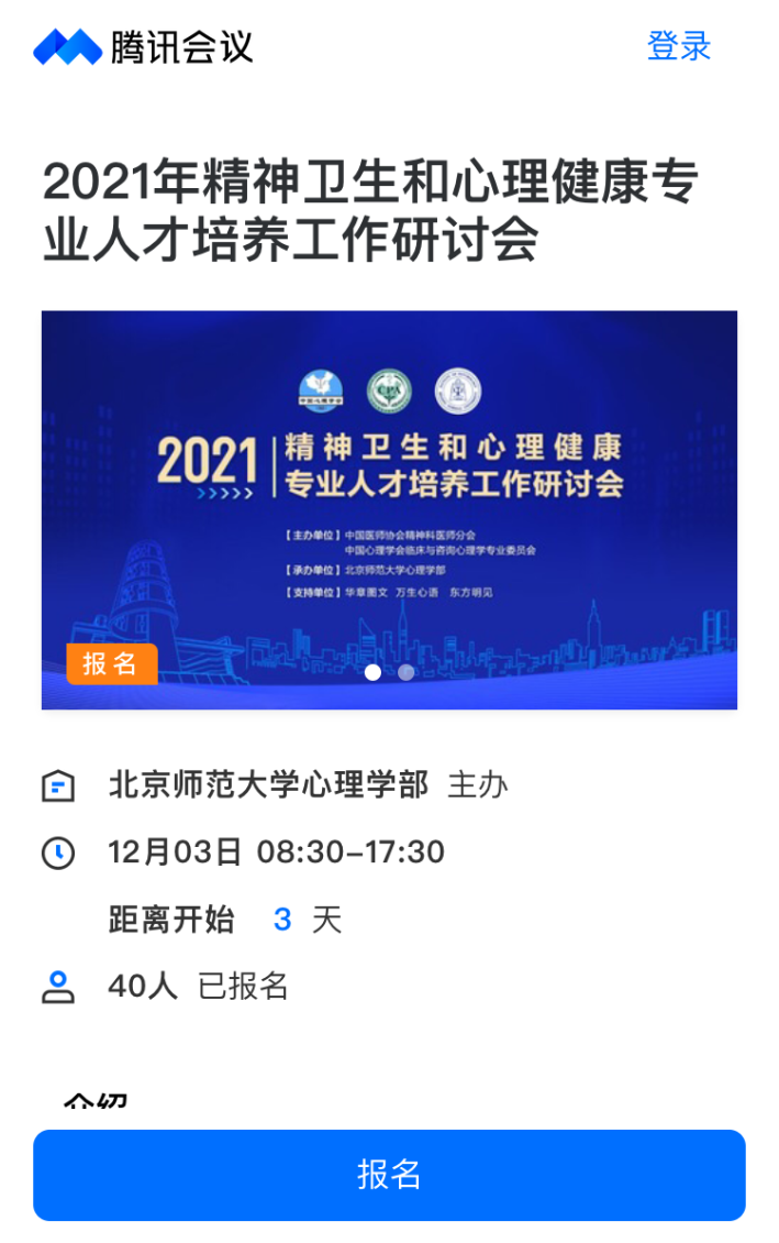 (3)电脑客户端参会流程 A、点击上方参会链接或扫描上方二维码,点击屏幕中的“报名”按钮,选择“账号密码登录”,选择“使用验证码登录”,输入您报名会议时所提交的手机号进行验证,验证完成后,页面若显示“报名审核通过”字样即为预约成功。 B、预约成功后,在腾讯会议中点击“我的会议列表”即可随时查看该会议详情,参与会议。