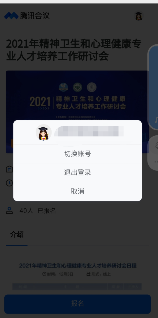 C、注意事项:若您安装腾讯会议客户端,且绑定的手机号不是您报名大会时所提交的手机号,可点击“屏幕右上角圆形图标”,选择“切换账号”选项,输入您报名会议时所提交的手机号完成验证。