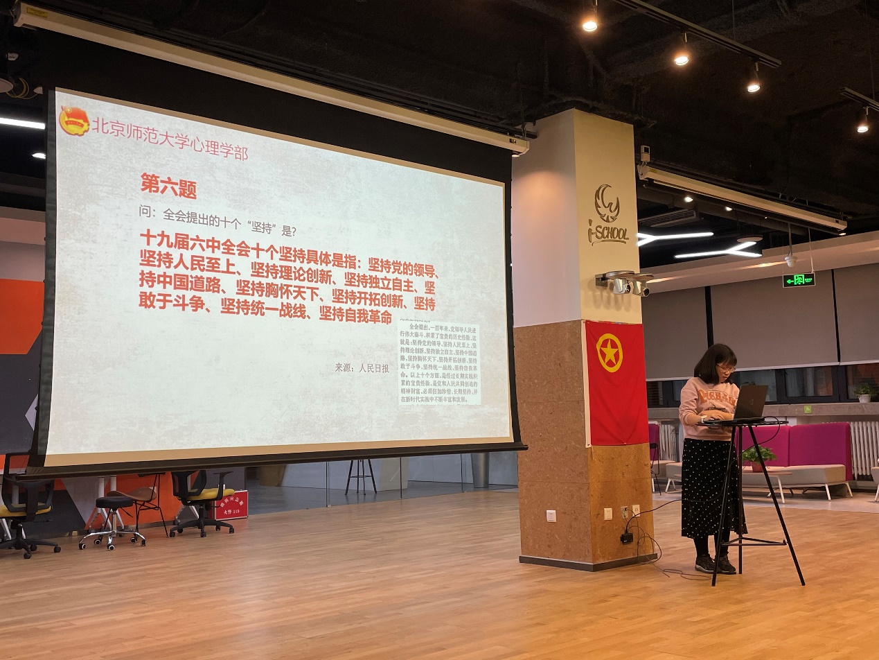 随后,同学们观看了《中国共产党第十九届中央委员会第六次全体会议公报》、《十九届六中全会微党课》,对十九届六中全会有了进一步的学习和了解,感触颇深。 接着,由何菁淼同学带领大家进行了知识问答环节。同学们踊跃参加、积极作答,复习了党的十九届六中全会提出的十个“坚持”、全会通过的重要决议等主要知识,收获颇丰。