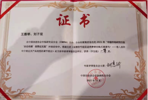 近日,在第三届中国市场研究行业“分众传媒”优秀论文奖活动决赛答辩中,我部MAP-BAC方向2018级专硕王雅琴同学和同导师组学硕刘子双同学的论文《表情符号能促进消费者的购买意愿吗?——卷入度的中介效应及产品类型的调节效应》经专家评审委员会评议,荣获学生组一等奖。 第三届中国市场研究行业优秀论文奖由中国信息协会市场研究业分会与分众传媒集团合作主办,旨在奖励市场研究和基于市场研究行业范式的营销策略研究、媒体研究、社会学研究、传播学研究、心理学研究等方向上的有关理论、方法与实践方面的优秀研究论文,继续发掘市场研究行业在专业领域的洞察与创新。