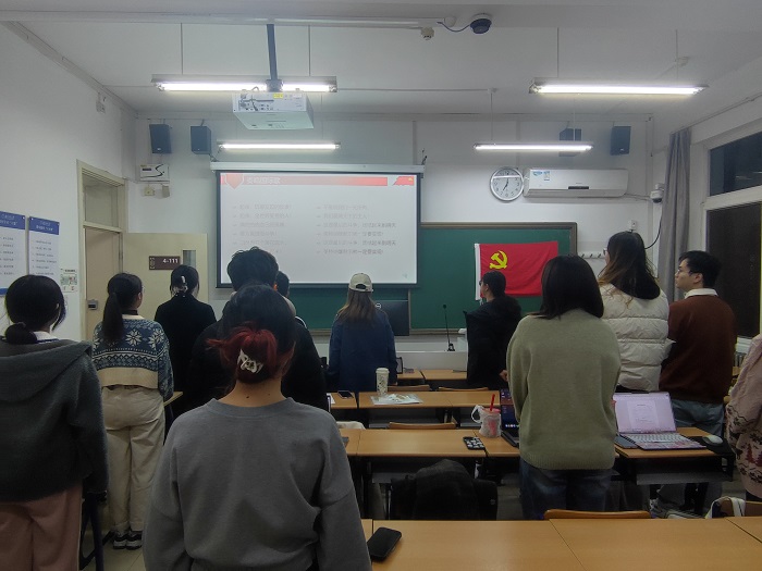 2024年12月1日19时,体育博彩网站 本科生第二党支部2024-2025学年秋季学期第一次预备党员转正大会于教四111顺利召开。本次会议主要讨论罗珏、赵桢碧、简心蕊、沙瑞欣四位同志的转正申请。会议由黄彤彤同志主持,共4位正式党员,18位预备党员参与。 会议开始,全体成员起立,奏唱《国际歌》。随后,党支部书记黄彤彤同志介绍本次预备党员转正大会流程。