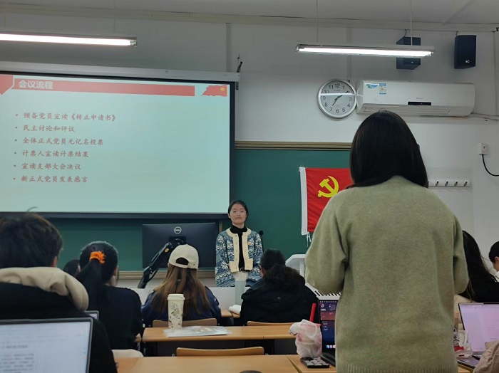 接下来,罗珏同志宣读《转正申请书》。她向党组织汇报了自己的学习、思想、工作情况。在一年预备期中,罗珏同志在思想作风、党性修养、学业方面均取得长足进步,并在支教和教育实习活动中践行教育理念,为成为一名合格的人民教师做准备。 在民主讨论与评议环节,刘千荻同志认为罗珏同志踏实勤奋,认真好学。黄彤彤同志认为罗珏同志在预备期内勤奋刻苦,工作上认真负责,与同学相处融洽,已具备成为一名正式党员的基本素养。