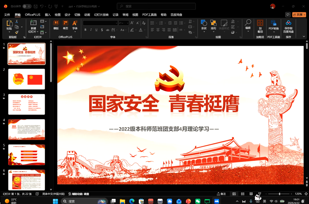 为深入学习贯彻总体国家安全观,增强青年学生的国家安全意识和责任感,在第十一个全民国家安全教育日来临之际,2022级本科师范班团支部于4月22日在线上组织开展了“国家安全 青春挺膺”主题团日活动,共有8名同学参与本次活动。
