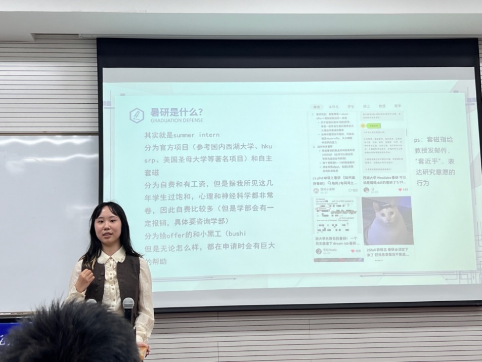 王珏莹同学从她申请暑研的亲身经历出发,向我们介绍了暑研的基本概念,套磁的流程和技巧,以及暑研的申请方法、时间线。王珏莹同学的分享拓宽了同学们的视野,为大家参与科研训练提供了新的途径和思路,也提供了行之有效的路径和经验供大家学习和参考。