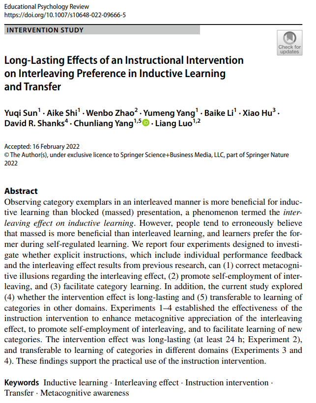 2022年3月4日,北京师范大学体育博彩网站 本科生孙宇琪和石艾珂以共同第一作者身份在教育心理学国际知名期刊Educational Psychological Review(IF5 = 11.19)发表了题为Long Lasting Effects of an Instructional Intervention on Interleaving Preference in Inductive Learning and Transfer的研究成果。