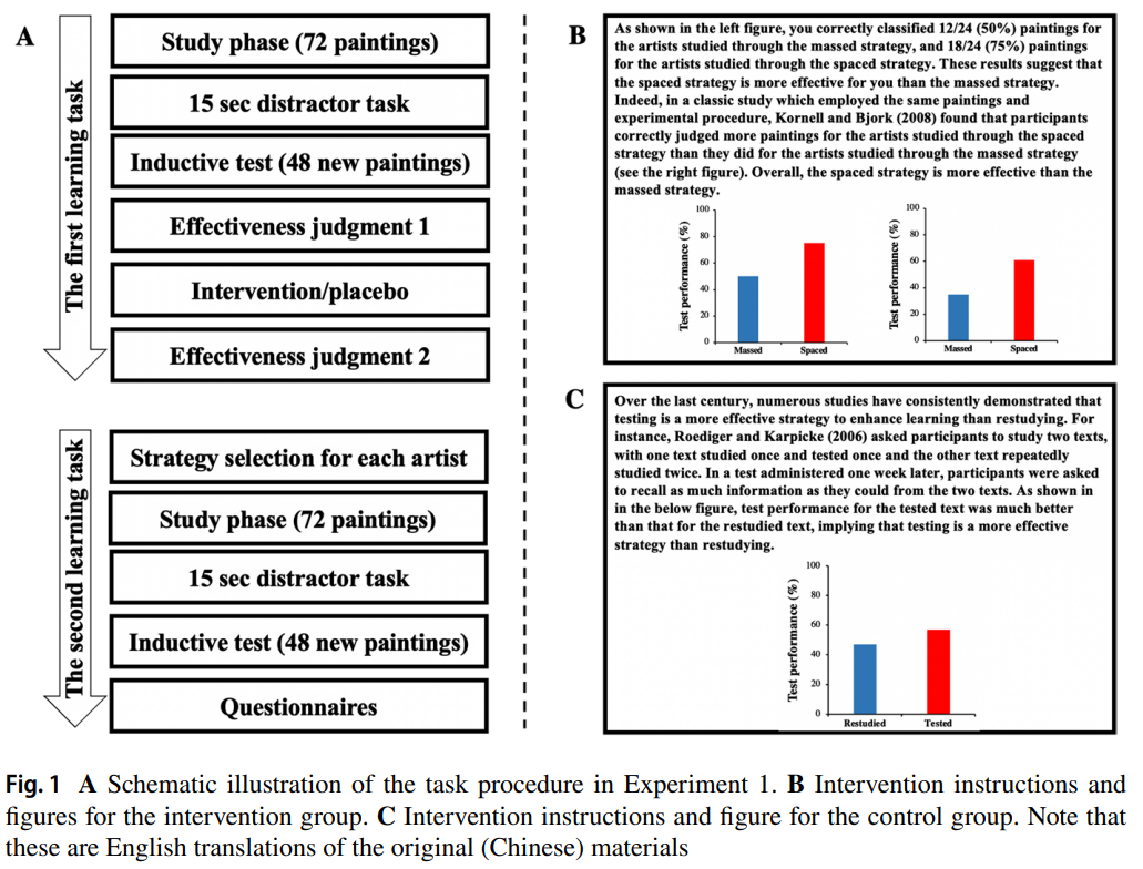 归纳学习(包括类别学习)是人们认识世界的重要途径。大量研究表明,相比较于比组块学习(massed learning;即组块呈现样例),交替学习(interleaved learning;即交替呈现样例)能够更有效地促进归纳学习效率,这种现象被称为交替效应(the interleaving effect)。尽管交替学习是一种更有效的学习策略,但人们却普遍错误地认为组块学习策略更有效,表现出元认知错觉。这种元认知错觉进一步导致人们在自主学习的情况下更多地使用更低效的组块学习策略进行归纳学习。北师大元认知与学习课题组(课题组网站见//metacog.bocaisports.net/)近期开展了一项干预研究,考察外显的指导语(explicit instructions)能否作为一种有效的干预策略,矫正这种元认知错觉,使得学习者能够意识到交替学习策略更有效,促使学习者主动使用交替学习策略并提高归纳学习效率。 本研究共包含四个实验。实验1共招募了60名北京师范大学大学生被试,他们被随机分配到干预组和控制组。在第一部分的学习任务中,两组被试需要学习12名画家的绘画风格。对于其中6名画家的绘画风格,被试需要采用组块学习策略进行学习,而对于另外6名画家的绘画风格则需要采用交替学习策略进行学习。学习结束后,两组被试参加一个简短的分心任务。之后,两组被试参加归纳测试。测试结束后,两组被试需要判断哪种学习策略更有效:1.交替学习更有效;2.两者相差不大;3.组块学习更有效。 之后,两组被试开始阅读干预指导语。在干预组的指导语中,每名被试可以看到自己在两种学习条件下的测试成绩和前人关于交替效应的研究结果(见下图B)。通过阅读干预指导语,干预组被试能够清晰地意识到交替学习策略比组块学习策略更有效。与之不同,控制组被试则阅读与交替效应无关的指导语(即阅读“安慰剂”指导语)。阅读完指导语后,两组被试再次判断哪种学习方法更有效:1.交替学习更有效;2.两者相差不大;3.组块学习更有效。 接下来,两组被试开始参加第二个学习任务。在第二个学习任务中,两组被试需要学习另外12个画家的绘画风格。对于每一个画家,他们需要决定使用哪种策略进行学习:1.交替法;2.组块法。随后,他们使用自己选择的策略学习每一位画家的绘画风格。学习结束后,两组被试参加归纳测试。