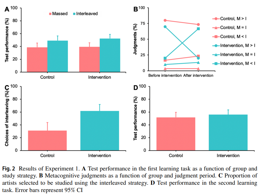 研究结果发现,(1)在第一个学习任务中,两组被试在交替学习条件下的成绩均显著高于在组块学习条件下的测试成绩,展现出了交替效应(见下图A);(2)在干预前,两组被试均错误地认为组块学习策略更有效,然而,在干预后,干预组正确地意识到交替学习策略更有效,而控制组依然错误地认为组块学习策略更有效(见下图B);(3)在第二个学习任务中,干预组被试更多地选择使用交替学习策略进行学习,而控制组则更多地选择使用组块学习策略(见下图C);(4)在第二个学习任务中,干预组的测试成绩高于控制组(见下图D)。 上述结果表明,外显的指导语是一种有效的干预策略,能够矫正学习者关于交替效应的元认知错觉,促进学习者更多地使用交替学习策略,从而提高归纳学习成绩。实验2-4重复了实验1的研究结果,并进一步发现这种干预效应是长时可持续的(实验2),而且能够成功迁移到不同领域的归纳学习(实验3和4)。