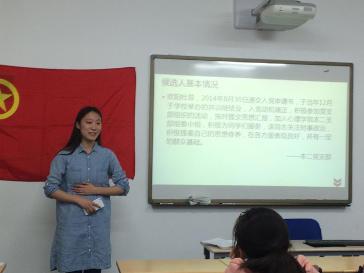 3月20号晚八点,心理学院本科14级2班于教二206举办了“推优入党团支部大会”。会议由团支书刘雅洁主持,2班团支部所有团员参加了本次会议。