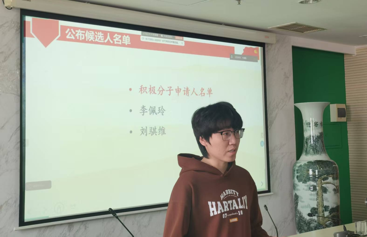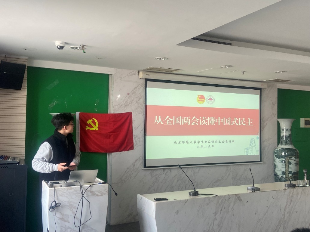 至此,团支部同意推荐李佩玲、刘骐维为入党积极分子,待党组织进一步审核考察。随后召开三月份主题团日活动。 本次活动与2024学术硕士第二党支部共建。恰逢今年全国两会盛大召开,活动邀请到了北京师范大学学生会宣讲团成员孙梓耀同志为我们作主题为《从全国两会读懂中国式民主》的主题党课分享。