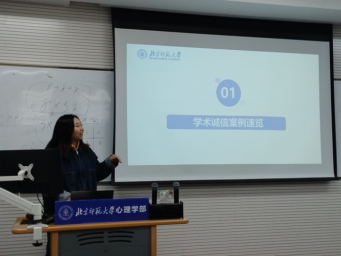班会伊始,项舒一同学以2个典型案例引入,体测替考被取消学位获得资格和硕士论文全文抄袭撤销学位。随后,项舒一同学带领大家学习学术规范制度精要。首先介绍了《国家教育考试违规处理办法》《北京师范大学本科生考场纪律及违纪认定的若干规定》等相关文件,重点解读违反考试纪律、考试作弊、违反学术规范、损害学术公正等核心条目,通过情景问答形式,帮助同学们明确课程考核、学术规范中的诚信边界。