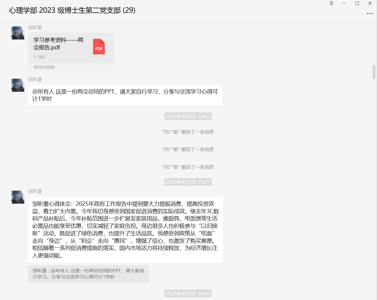 | 【党建】2023级博士生第二党支部线上学习讨论会:学习2025全国两会《政府工作报告》 |