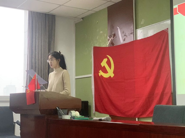 首先,全体参会人员面向党旗起立,齐唱《国际歌》。随后,支部书记廖晨曦介绍转正流程。 之后,预备党员杨晟妮、关岳琳、梁静分别向党组织汇报了她们在预备党员期间的思想、工作和学习各方面的表现。她们均能够正确地认识了自己的不足,同时也表明在成为正式党员后,会不断完善和提高自己。
