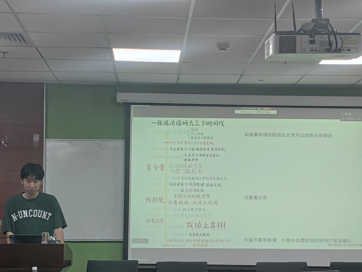 接着,由王杰堃师兄给同学们带来保研时间线、报名技巧、填报流程和心理准备等方面进行分享。 本次保研经验分享活动圆满结束。