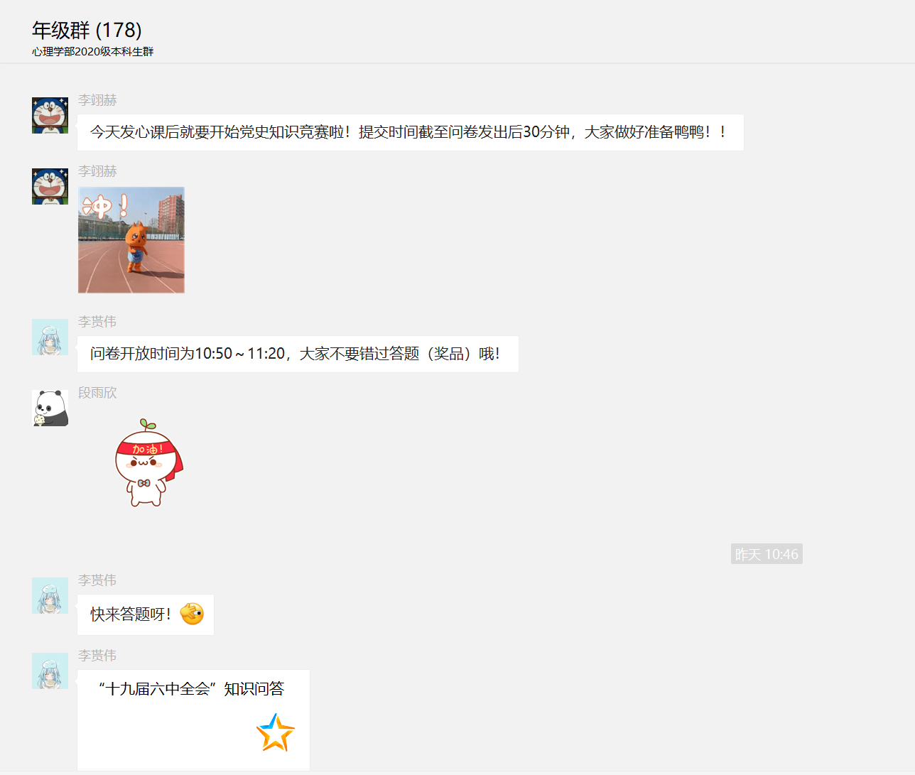 活动于12月16日上午利用专业课下课后年级同学聚在一起的机会,于10:50正式开始。主办方在年级群中发放竞赛问卷,年级共82名团员参加了活动,团员们努力思考、回忆学习的党史知识、会议有关精神并和同学们积极讨论,学习氛围热烈。