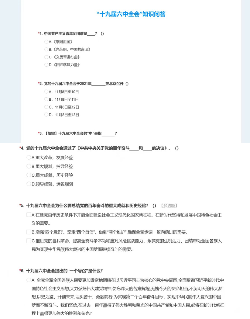 主办方提前编制党史知识竞赛试题,内容涵盖党、团的基本知识、党史知识,和党的十九届六中全会精神和《中共中央关于党的百年奋斗重大成就和历史经验的决议》有关内容。