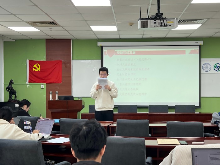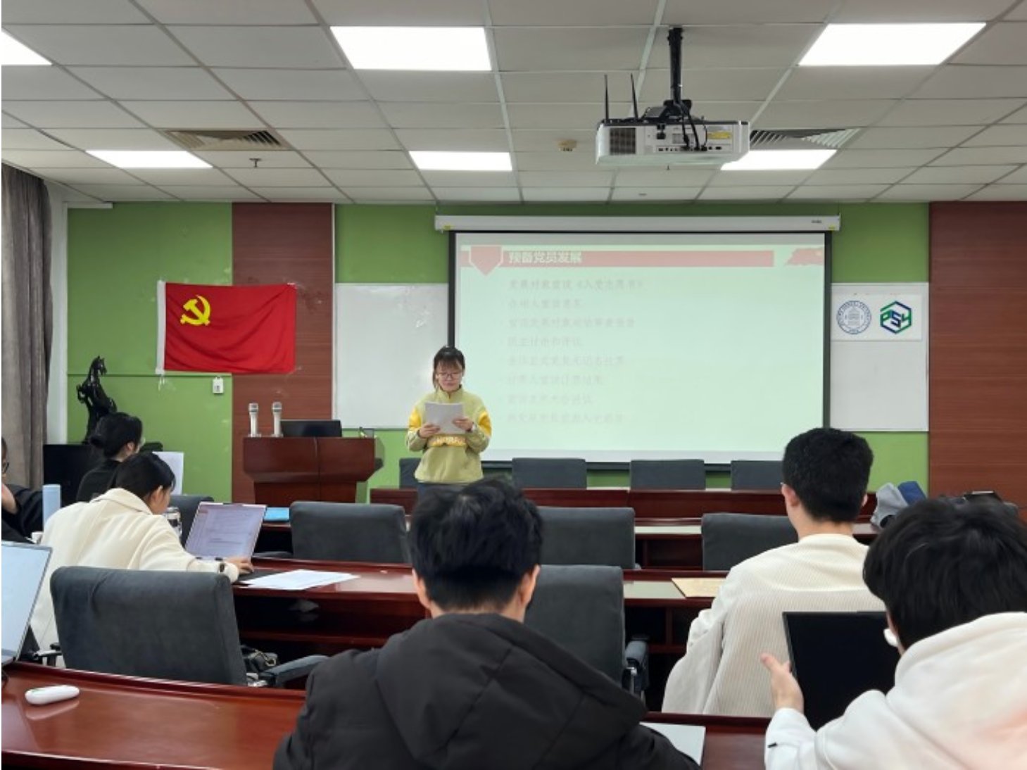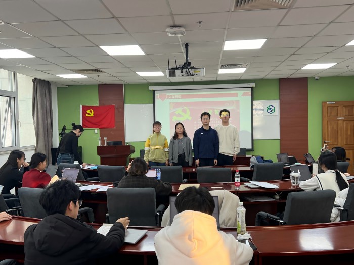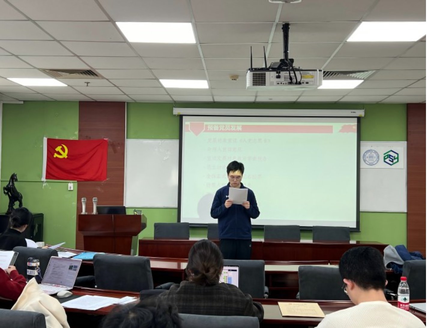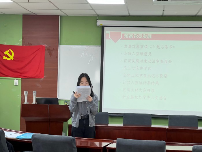 2024年11月23日14:00,体育博彩网站 本科生第二党支部在后主楼1420东召开2024-2025学年秋季学期第二次党员发展大会。会议由党支部书记黄彤彤同志主持,支部内共12名党员与预备党员参会。 首先,全体起立,奏唱《国际歌》。随后由党支部书记黄彤彤同志介绍大会流程及拟发展对象。 发展对象赵娅汛、孙聪慧、张嘉明、徐傲同志依次宣读了自己的入党志愿书。在宣读过程中,四位同志以诚恳而坚定的语言,表达了自己对党组织的忠诚与向往。每一位同志都详细地汇报了自己对于党的理解和加入党组织的动机,并结合自己的成长经历和思想历程,阐述了自己在向党组织靠近的过程中所做出的努力。