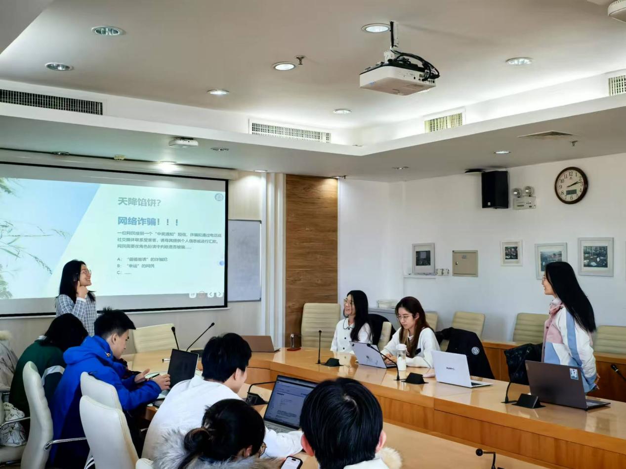 在活动的压轴环节,模拟法庭与情境体验环节,作为本次活动的一大亮点,同学们通过角色扮演和现场讨论,生动模拟了网络诈骗和知识产权侵权等典型法律情境。在网络诈骗案件的模拟中,同学们分别扮演了诈骗犯和受害网民的角色,深入探讨了如何识别网络诈骗的常见手段,以及在遭遇诈骗时如何运用法律武器维护自身合法权益。