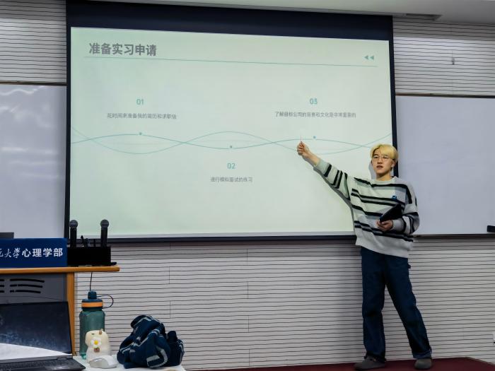 接下来分享的是伍伟霖师兄,师兄与我们分享了准备实习申请需要提前做的一些功课:准备简历与求职信、进行模拟面试的练习、了解目标公司的背景和文化等。在此过程中,师兄也与我们分享了自己的简历与推荐的进行模拟面试的方式,如:与同伴模拟练习或者借助AI软件进行练习。同时,师兄也与我们分享了自己在北森的实习经历。