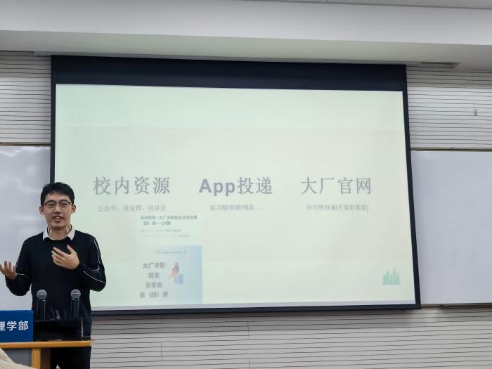 2024年11月23日18:30,体育博彩网站 2023级本科综合班于金丰和609成功举行了11月主题班会。 在本次主题班会中,来自2021级的马啸天师兄和伍伟霖师兄为我们带来了精彩的暑期实习经验分享。首先为我们带来分享的是马啸天师兄,师兄首先为我们大致介绍了找实习工作的几条途径——借助校内资源、通过App进行投递和通过大厂官网进行针对性投递。接着,师兄以自己的简历为例,向大家详细介绍了如何去撰写一份正式的简历以及撰写简历过程中的一些小建议,并与我们分享了自己在韶音科技的实习经历。在分享的最后,师兄送给大家一段寄语:“人生是一段旅途,你的路还很长。希望大家都能有光明的未来!”