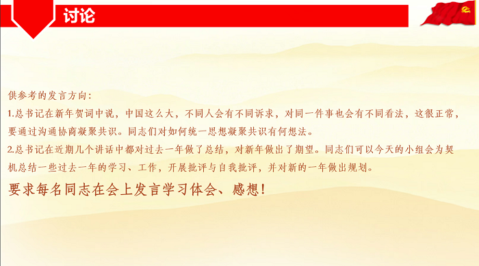 首先,全体起立,奏唱《国际歌》。随后,第二党支部第四小组组长程先楷同志共享了针对习近平主席2023年新年贺词的新闻报道,同志们一起在腾讯会议中观看学习。