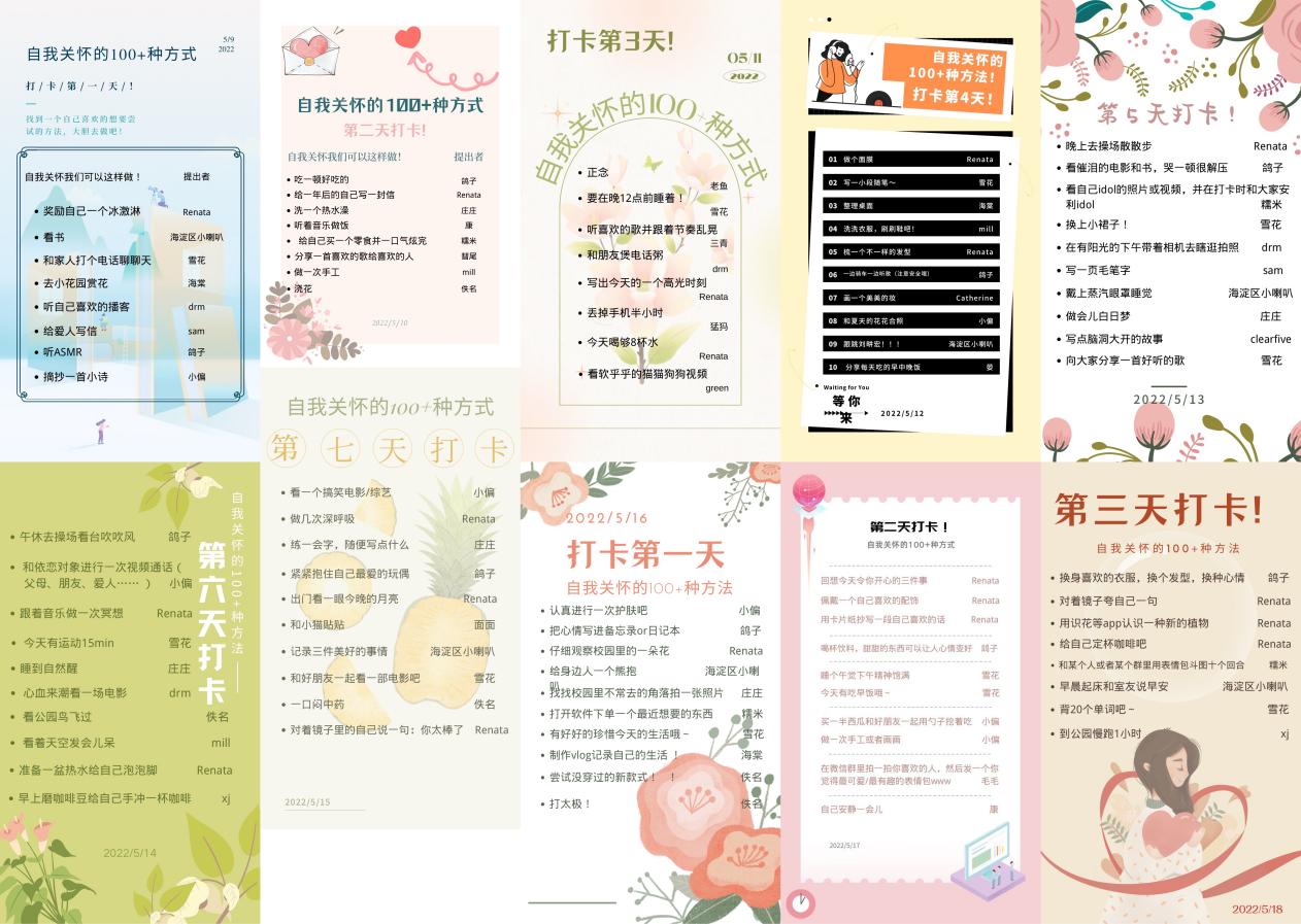 在繁忙的日常学习生活中我们兼顾了学业、人际、工作,但会不会忽略了对自己的关怀呢?一些小小的关爱自己的方式,有可能就会提升我们的生活幸福感。这是自我关怀活动的策划初心,本期自我关怀活动作为2022年度“5·25”大学生心理健康节的系列活动之一,通过简单的打卡活动让大家分享、交换、收获自我关怀小妙招,从点滴中治愈自己!