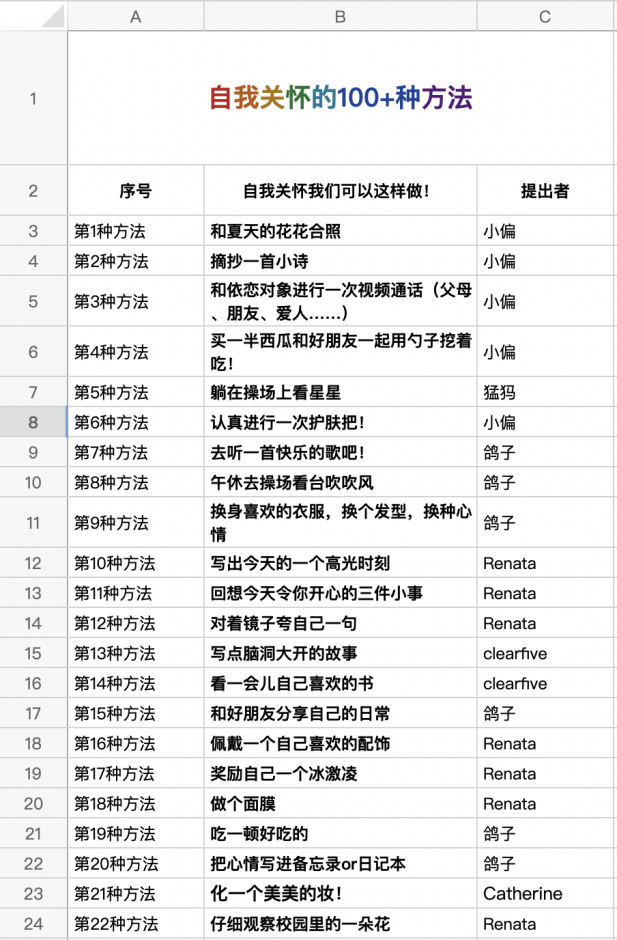 2022年5月9日,由生活指导室主办的《自我关怀小组 第三期:自我关怀的100+种方法》如期展开,活动为期两周,本次活动吸引了40余名来自体育博彩网站 及其他兄弟院系同学的参与。在活动正式开始前邀请互动参与者以匿名或化名的形式分享生活中的自我关怀方法,构建本期活动的自我关怀箱,共计收到122种方法。