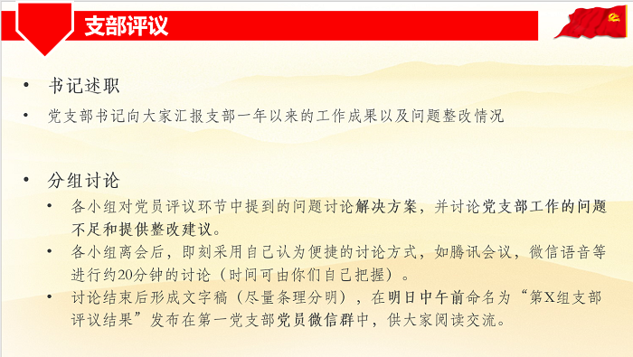 最后是支部评议,包括书记述职和分组讨论两个环节。支部书记梁静同志对2021年支部的活动进行了一个简要的总结,对之前民主评议中提出的问题,支书也向大家汇报了支部采用的解决办法。分组讨论环节要求提前分好的4个小组在离会后采用各自认为便捷的小组讨论方式,对党员评议环节中提到的问题讨论解决方案,并讨论党支部工作的问题、不足和整改建议,最终形成文字稿提交。