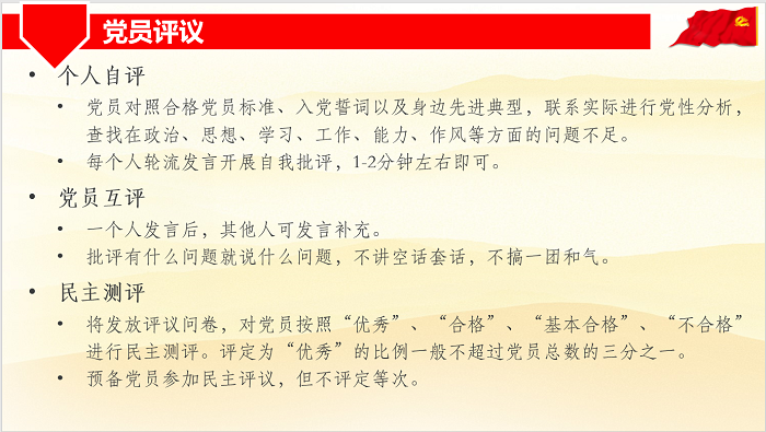 首先是理论学习。支书在会前一周已将《习近平总书记“七一”讲话内容》、《中共中央关于党的百年奋斗重大成就和历史经验的决议》、《中国共产党普通高等学校基层组织工作条例》等学习材料发放给全体同志,要求所有人认真自学材料,并将在开会时以问卷的形式测试大家的学习效果。在会议开始前,全体参会同志填写签到问卷和学习材料测试问卷,以测试自己的学习效果以及巩固材料中的核心内容。 之后是党员评议,分为个人自评、党员互评和民主测评三个程序。每位党员及预备党员同志轮流进行1-2分钟左右的发言,对照新时代合格党员标准、入党誓词、革命先辈以及身边先进典型,联系实际进行党性分析,查找在政治、思想、学习、工作、能力、纪律、作风等方面的问题和不足。除了有事请假的同志由支书在会上代为宣读个人自评内容外,每位同志都在会上实事求是地对自己进行了深刻的自我批评。有的从现实事件如冬奥会出发,谈论现实自我与理想自我的差距;有的回顾自己长期存在的问题,对自己一年来的表现进行了汇总和反思;有的侧重于党性与修养;有的着眼于实践和能力。待所有同志发言完毕后,支书发放民主测评问卷,要求在场同志按照“优秀”、“合格”、“基本合格”和“不合格”对支部内的所有正式党员进行评价。