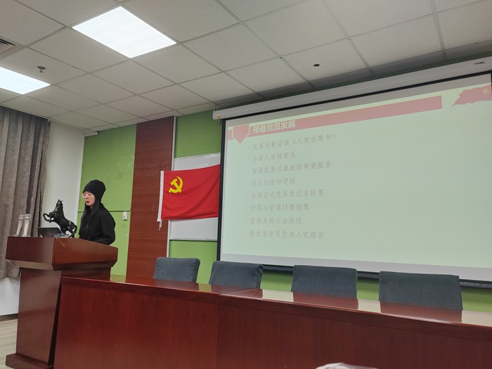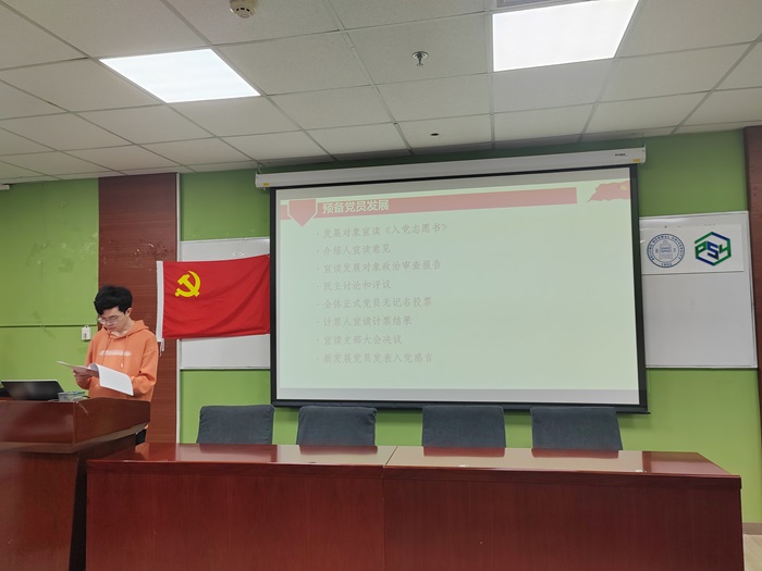 会议开始,党支部全体成员起立,奏唱《国际歌》。支部书记黄彤彤同志介绍此次发展大会的流程。