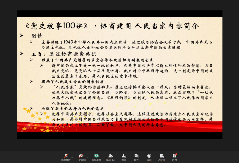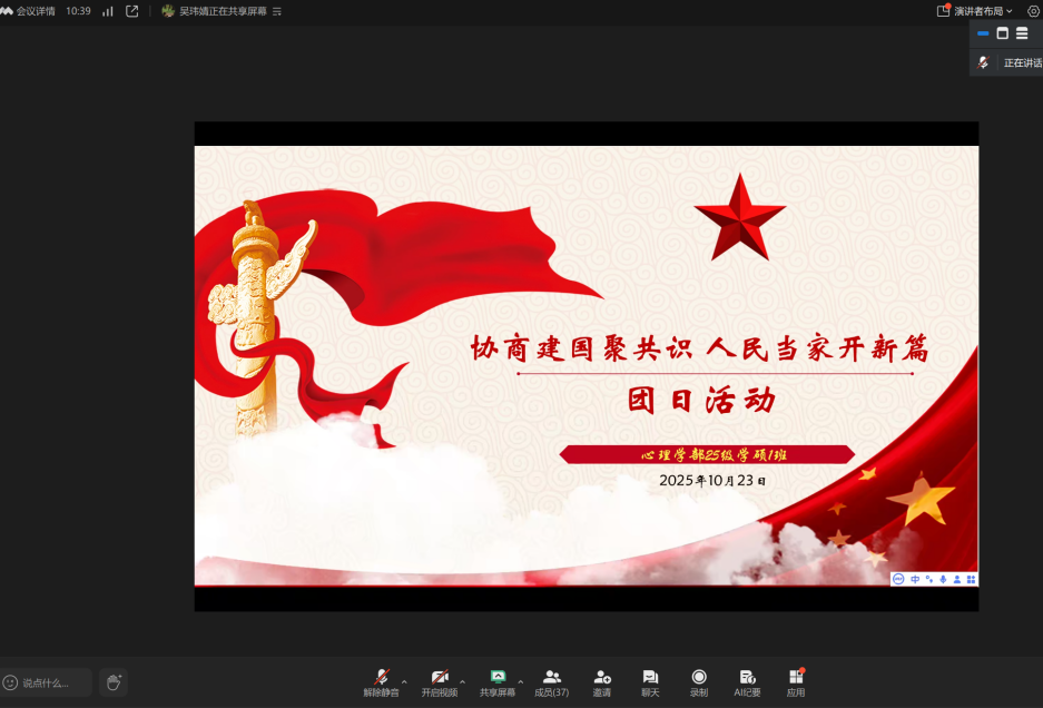 为深入学习贯彻习近平新时代中国特色社会主义思想,弘扬爱国主义精神,厚植青年学生的家国情怀,10月23日晚,25级学硕第一团支部在线上成功举办“协商建国聚共识,人民当家开新篇”主题团日活动。本次活动应到团员70人,实到41人,请假29人。 本次主题团日活动依次开展了四项主要内容:全体团员奏唱中国共产主义青年团团歌,系统学习《党史故事100讲·协商建国 人民当家》的核心内容与精神实质,集体观看《党史故事》精选视频片段,以及开展团员交流研讨。本次活动旨在引导团员青年回顾新中国成立的伟大历程,学习中国共产党领导全国各界人民通过政治协商实现建国大业的历史经验,进一步坚定理想信念,增强历史使命感与责任感。