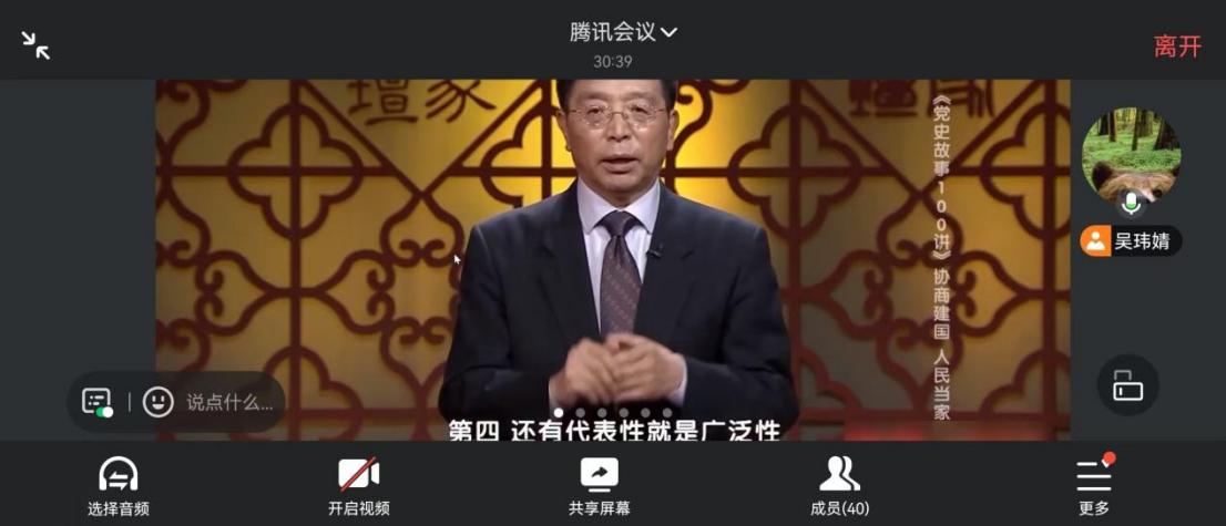 在主题学习环节,团支部书记吴玮婧首先为团员们讲解了《党史故事100讲·协商建国 人民当家》的核心内容与精神实质。随后,全体团员共同观看了专题历史视频资料。影片生动再现了1949年新中国成立前后,中国共产党与各民主党派、无党派人士及社会各界代表,通过中国人民政治协商会议共商国是、筹建新中国的光辉历程,展现了中国共产党以宽广胸怀和远见卓识,团结各方力量共同开创中国政治制度新篇章的壮阔场景。