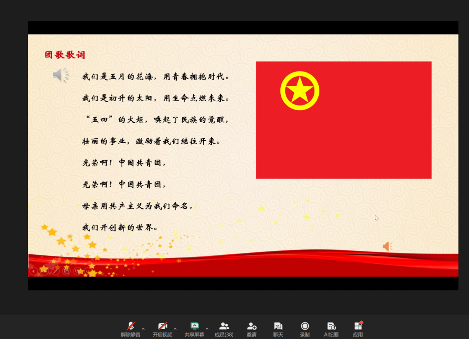 在团支部书记吴玮婧的带领下,活动在庄严的团歌声中拉开序幕。全体团员精神饱满,齐声高唱《中国共青团团歌》。激昂的旋律回荡在网络会议室,唱出了团员们对共青团组织的热爱与忠诚,展现了新时代青年不忘初心、勇毅前行的坚定信念。