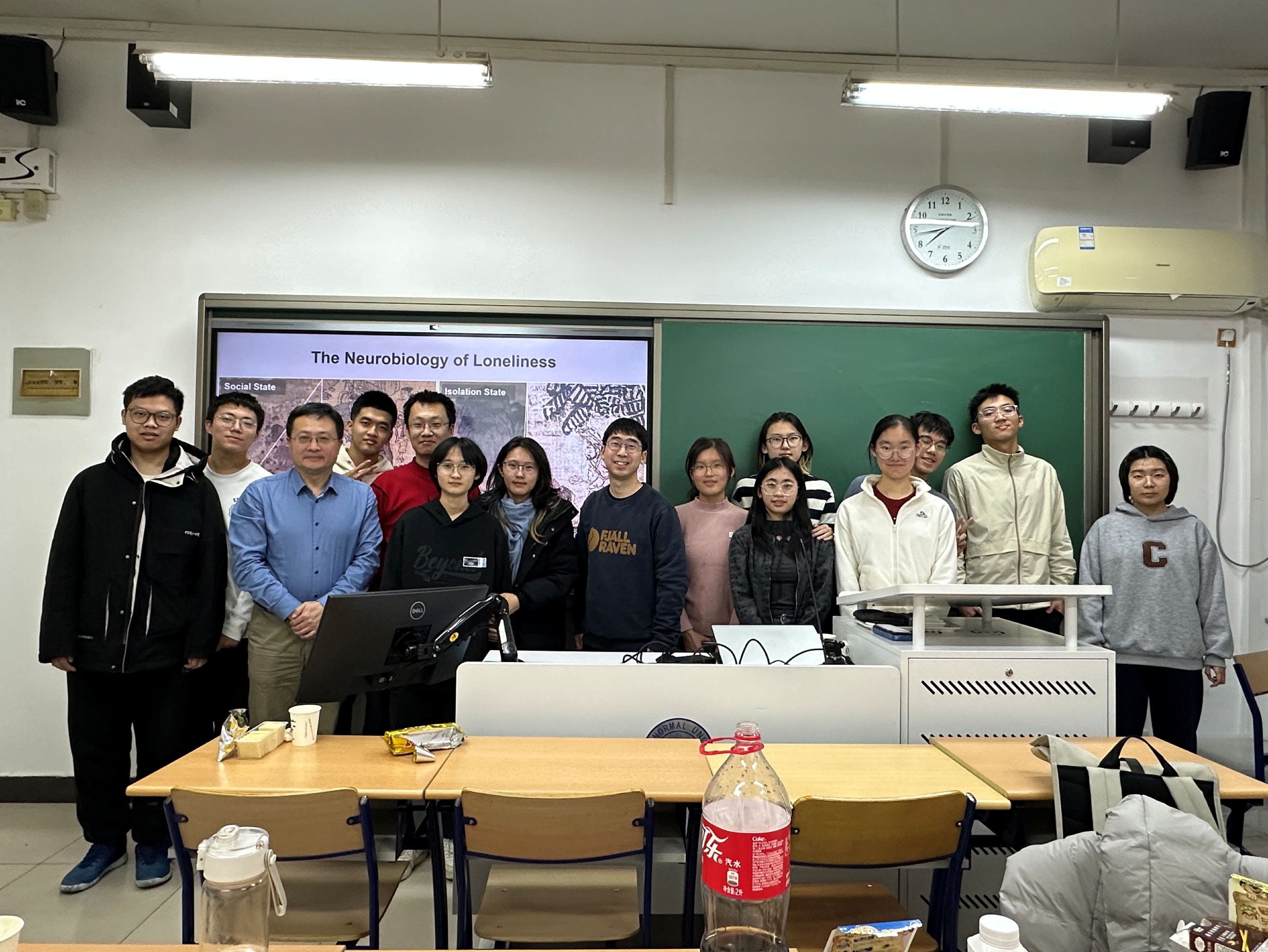 刘老师首先和同学们分享了自己最新研究成果,从社交需求对动物和人类的重要性出发,关注到“剥夺社交需求后的社交反弹”这一有趣现象。刘鼎老师研究以小鼠作为研究对象,通过一系列动物行为学和神经机理研究,发现:社交剥夺时间与社交需求反弹程度成正比,且触觉通道在小鼠社交活动中具有重要地位,进一步利用遗传学手段揭示出响应社交需求的下丘脑神经元群。 在随后自由交流环节,同学们提出了自己感兴趣的问题,包括孤独感背后的神经机制、如何掌握新的研究技术、如何在大学低年级入门科研等。刘老师采用启发式教学法一一给予了解答,并指出兴趣对于科研工作的重要性,同时要坚持对数理知识的学习和对逻辑思维能力的培养。左老师和胡老师也不时参与讨论,分别分享了自身对于科研生涯发展的经验和建议。最后,三位老师们鼓励同学们要善于提升自我学习动机,掌握科研所需的数理知识和实验技能。 经过本次活动,同学们加深了对科研工作的理解,进一步增强了对脑科学的兴趣。综合励耘方向团队未来将持续进行“月光脑盒”活动,为高素质本科生培养搭建高水平学术交流平台,营造良好的科研育人氛围,助力本科生尽早融入科学研究、明确学术发展方向。
