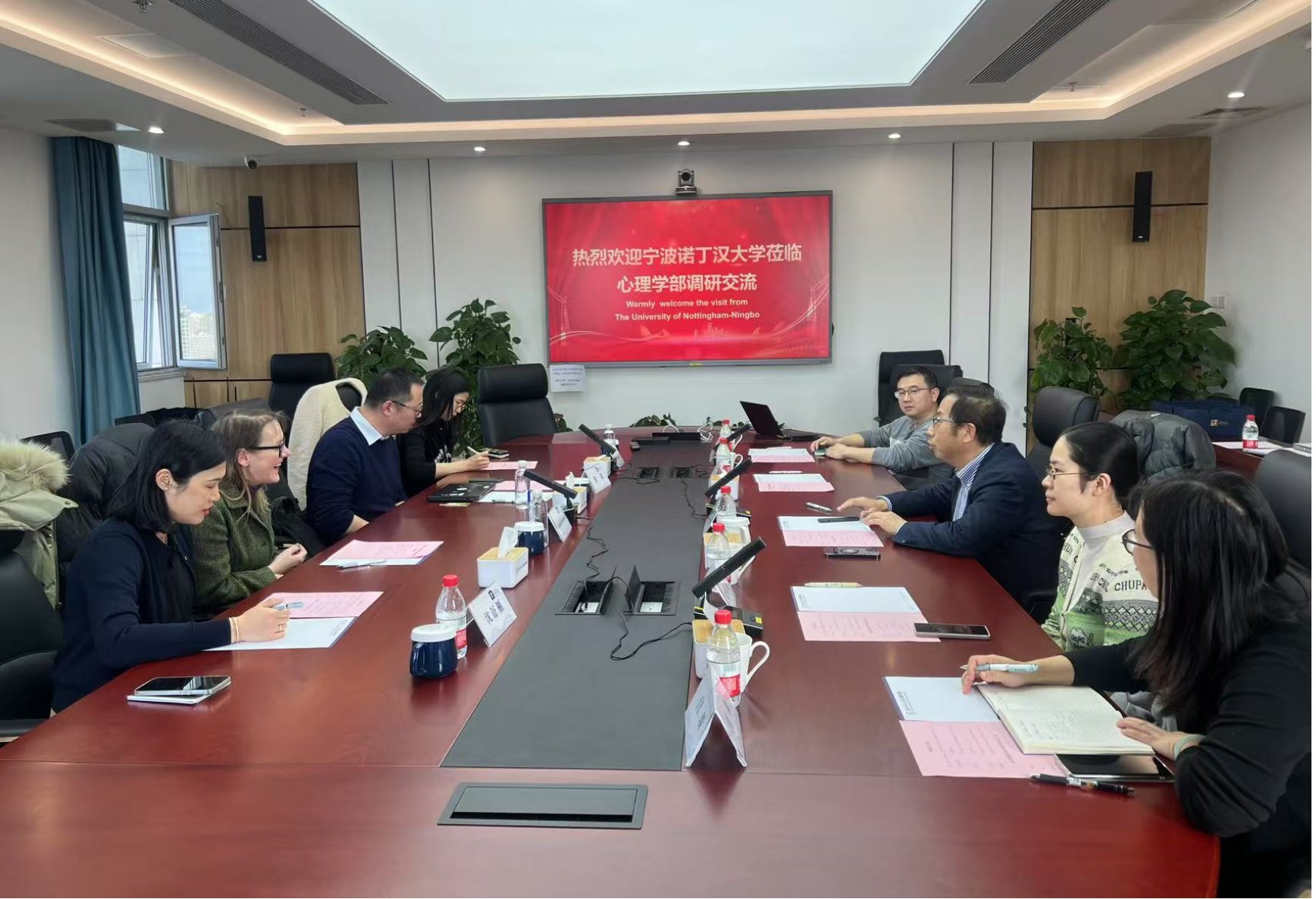 2025年3月18日,宁波诺丁汉大学校管理委员会委员、人文社科学院院长Catriona Morrison 教授、宁波诺丁汉大学校党委委员、人文社科学院党委书记戴一淼、人文社科学院行政主管吴思容、人文社科学院学生事务主管沈舒雁来访博彩网站-体育博彩网站 并举行座谈交流会。博彩网站 党委书记乔志宏、副部长骆方、副部长胡思源、党委副书记闫琰、党委副书记史佳鑫、办公室主任滕丽美出席座谈会。会议由乔志宏主持。