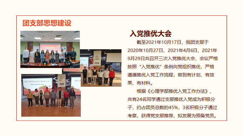 在开展个人批评与自我批评的同时,支委会也对过去一年的工作进行了批评与总结。过去一年,支委会积极履职,完成了上级布置的各项任务,在优秀团支部评选中获第一名。我们做好规定动作的同时,也做好自选动作,各项团活动做到创新,内容丰富,不走过场,不装样子。 同时,支委会的工作也有不足,支委会在学业上模范带头作用尚需加强,支部的推送出现错别字,排版问题。其次,支委会对同学们的服务解难主动但还不够深入;在疫情的影响下,支委会未能给同学们提供足够的人文关怀,未能及时了解大家的心理状况。 此后,团员代表窦佳宁同学进行发言。作为获得文明宿舍一等奖宿舍的宿舍长,窦佳宁同学为大家分享了在团小组共同学习过程中的经验,她认为,在团小组中大家的互帮互助对共同的发展有重要意义,此外,将学习党的理论和日常生活相结合,也在日常的学习生活中有重要意义。