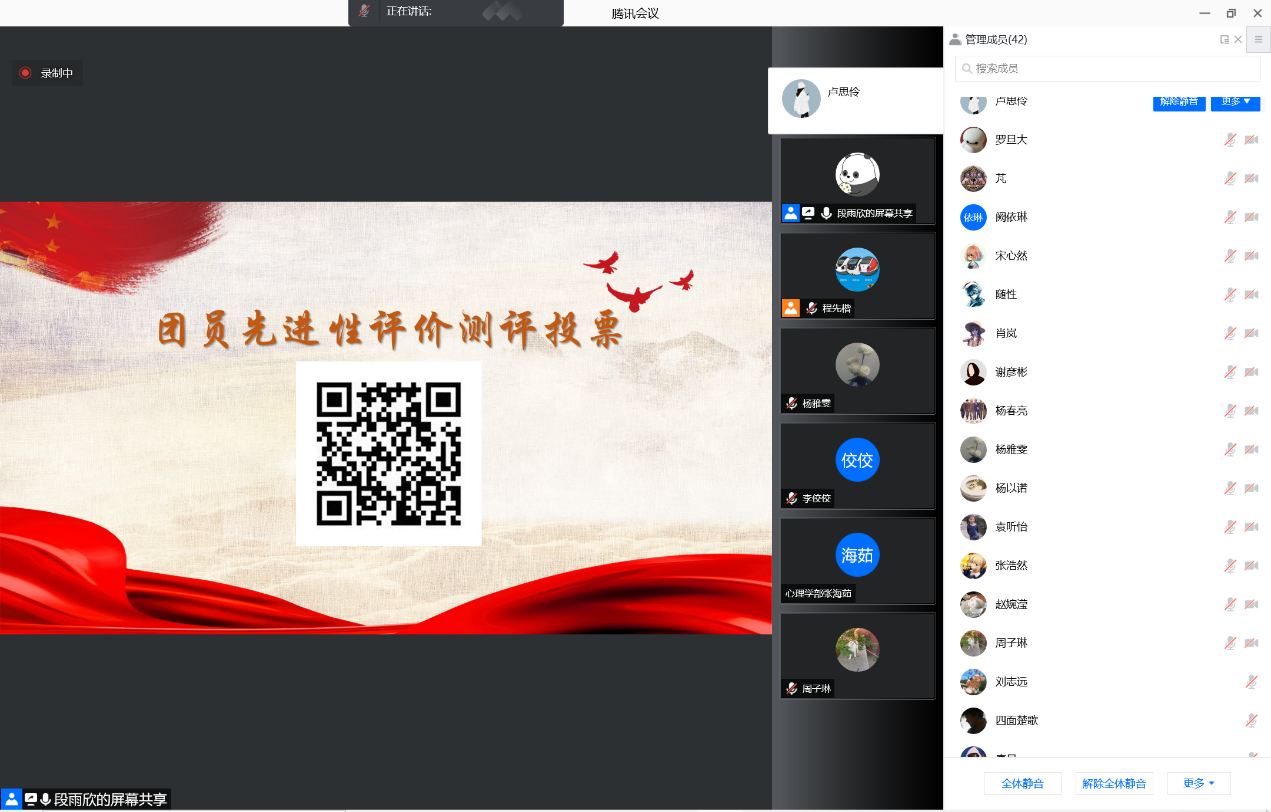 三位嘉宾的精彩的分享涵盖学业、科研实习、生活等多方面,解答了大家近期的困惑,让各位团员同学受益匪浅。接下来团支书段雨欣同学汇报了团支部上一学年整体工作、开展党史学习教育情况,特别是学习习近平总书记“七一”重要讲话精神情况和组织生活会准备情况,并结合团支部工作和个人实际交流体会认识。
