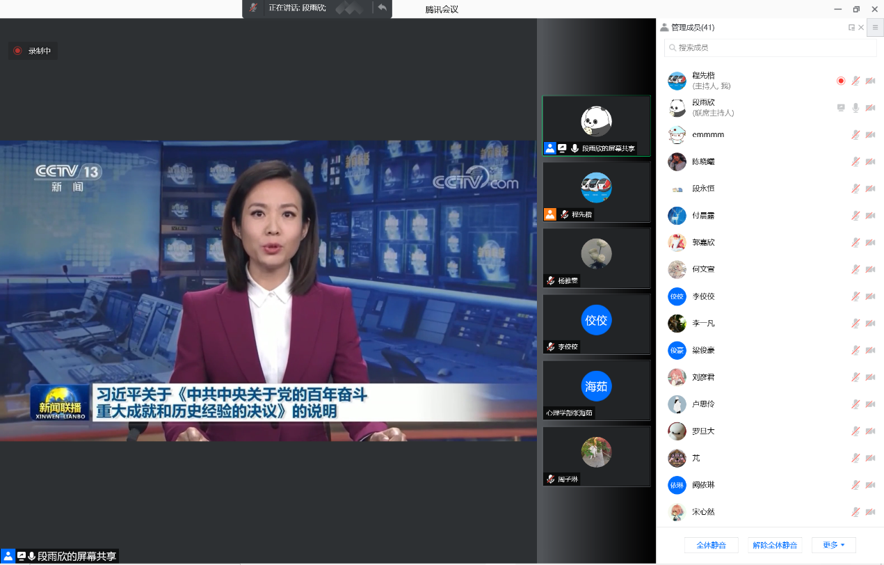随后,为深入学习领会、全面贯彻落实十九届六中全会精神,将党史学习教育继续推向深入,我班开展了学习十九届六中全会精神主题党史学习,同学们在会上观看了总书记对《中共中央关于党的百年奋斗重大成就和历史经验的决议》说明的有关报道,支部还分享了《决议》全文等学习材料共团员们会后学习,团员们结合组织生活会上批评与自我批评的内容和老师、师姐们的分享,查找自身不足,结合自身工作、学习实际分享了学习《决议》的感想。