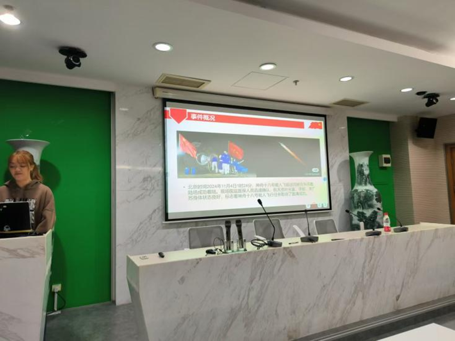 2024年11月10日20点时,体育博彩网站 本科生第二党支部第2党小组在后主楼1318召开十一月党小组会。本次会议内容为时事分享,会议由赵桢碧同志主持,共16名同志参与。 肖卓莹和易昊钦同志向大家分享了“神舟十八号返回舱成功着陆”的热点时事。两位同志从神舟十八号三位航天员的起飞到航天任务再到降落进行了分享,帮助各位同志们回顾了神舟十八号的各项事宜,同时就神舟十八号顺利降落的意义与各位同志进行了交流与讨论。 随后,潘俊宇和段旭同志以“高水平开放开辟中国式现代化广阔前景”为主题,向各位同志讲述了20届三中全会中针对“高水平对外开放”的相关论述与政策。两位同志也分享了我国“高水平对外开放”目前取得的各项显著成果,在今后我们仍需坚持以开放促改革、促发展,在扩大国际合作中提升开放能力。