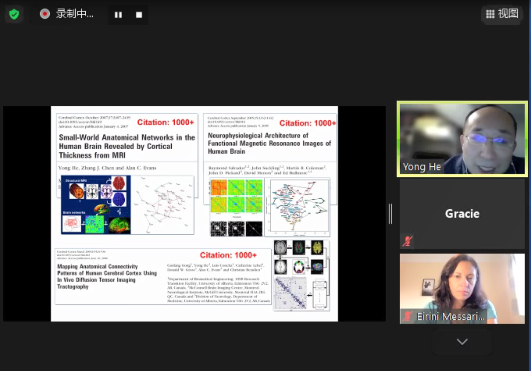 中英“心”青年沙龙(Sino-UK “Mind” Salon)第五讲于11月15日在线上举办。近50名来自中英双方的研究人员和学生参与了本期讲座活动,卡迪夫大学脑研究成像中心主任Derek Jones教授也出席了此次活动。 本期活动的两项报告,分别为北师大认知神经科学与学习国家重点实验室副主任贺永教授所做的“基于神经影像的儿童脑发育连接组学”的报告,以及卡迪夫大学脑研究成像中心Eirini Messaritaki博士带来的“脑网络结构与功能研究”报告。报告后,双方就脑网络与连接组学展开了深入交流讨论,并探讨了现在与未来科研合作的规划。