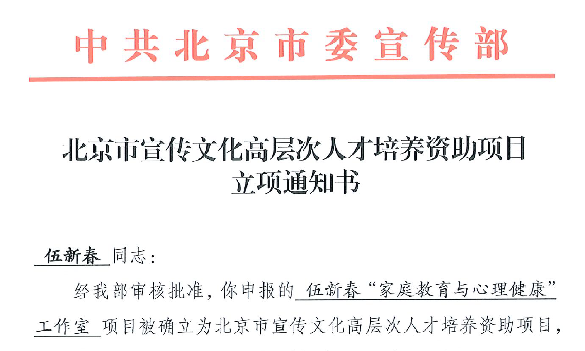 此外,近日我部还接到北京市委宣传部通知,伍新春教授申报的伍新春“家庭教育与心理健康”工作室被正式设立为北京市委宣传部的文化名家工作室,其项目被确立为北京市宣传文化高层次人才培养资助项目。 该工作室将依据近年来党中央和国务院在青少年心理健康与家庭教育领域颁布的一系列法规政策,以“家庭累积风险对青少年心理健康的影响:基于情绪调节的干预策略研究”项目为工作重点,深入剖析家庭累积风险对青少年心理健康的影响机制,并设计切实可行的情绪调节干预方案。项目的实施,将有助于推动家庭、学校和社会协同育人机制的构建,为青少年心理健康工作的有效开展提供科学研究依据和循证实践示范。 |