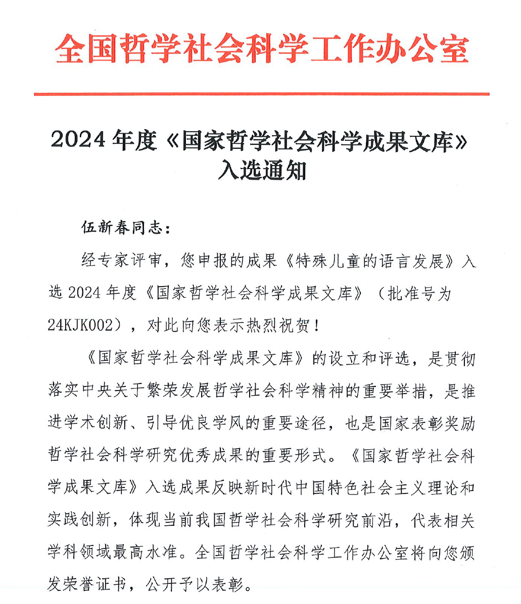 该成果以伍新春教授作为首席专家完成的国家社会科学基金重大项目 “残疾人语言障碍与学习机制研究”(13&ZD188)及其他相关课题的研究成果为基础,整合其研究团队在国内外学术期刊发表的百余篇论文,经过十余载潜心研究,精心编著而成。 评审专家认为:该成果在总结国内外已有研究积累的基础上,基于我国特殊儿童语言能力提升的需要,采用发展与教育心理学、心理语言学、认知神经科学、特殊教育等多学科交叉的视角,使用量表测验、眼动记录、脑电研究等多种研究手段,从行为研究和脑机制研究两个方面深入探讨了听障、视障和智障三类特殊儿童的语言发展特点及其机制,并提出了有针对性的教育干预方案,具有重大的学术创新价值和重要的教育实践意义。同时,8位评审专家也基于不同的专业视角提出了宝贵的修改意见和建议,将进一步助力该专著质量的提升和优化。 据悉,2024年度全国共有61项成果成功入选《国家哲学社会科学成果文库》。文库的设立和评选,是贯彻落实中央关于繁荣哲学社会科学精神的重要举措,是推进学术创新、引导优良学风的重要途径,也是国家表彰奖励哲学社会科学研究优秀成果的重要形式。文库入选成果反映新时代中国特色社会主义理论和实践创新,体现我国当代哲学社会科学研究前沿,代表相关学科领域的最高水准。