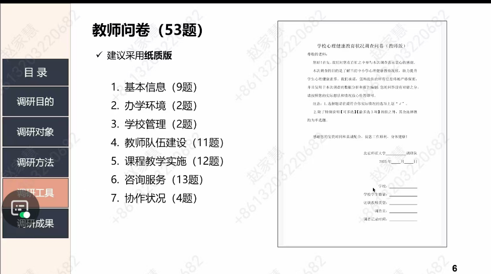 2025年6月29日18时整,体育博彩网站 团委社会实践部组织的博彩网站-体育博彩网站 “知行心育”青少年心理素养播种行动重点项目心理健康教育情况调研培训在线上通过腾讯会议顺利召开,主讲人为负责重点项目调研设计的吴怡萱。此次培训会旨在让重点项目队伍深入了解暑假调研的各项要求,为后续调研工作的顺利开展奠定坚实基础。 培训会上,主讲人吴怡萱首先对本次调研的目的、对象、方法、工具与成果呈现进行了详细讲解。调研目的是了解乡村地区学生心理健康教育现状,助力提升学生心理健康素养。调研对象主要包括心理健康教育相关老师,如心理健康老师、班主任、德育主任等,从学校方面了解学生心理状况;同时评估在校学生对自己心理状况的评价和家长对自己孩子心理健康情况的了解程度。主讲人还展示了针对不同对象的心理健康测量工具,以确保调研数据的科学性和准确性,例如教师问卷(53 题),包含基本信息、办学环境、学校管理、教师队伍建设、课程教学实施、咨询服务、协作状况等板块。调研完成后,各实践队需要将调研数据汇总,形成完整的调研报告。